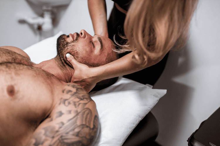 Therapist performing hands-on neck massage for male patient